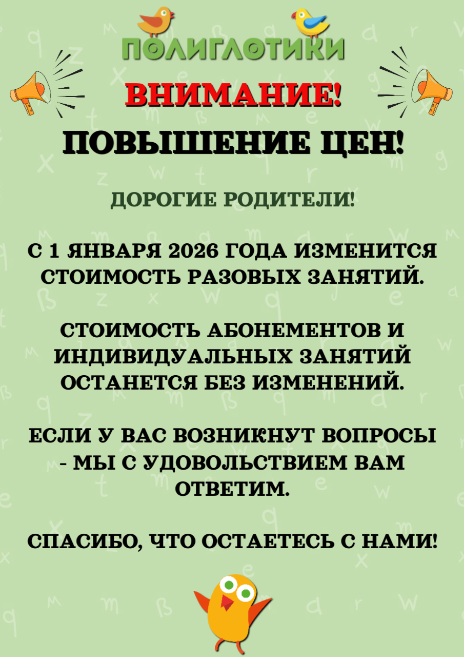 С 2026 года, произойдет повышение стоимости на 100 рублей на все разовые групповые занятия, при этом стоимость на индивидуальные занятия и абонементы не изменится.