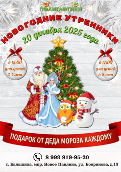 Спешите посетить наши новогодние утренники для детей от 2-4 лет и от 5-8 лет, будет очень интересно и познавательно, а главное каждый ребёнок уйдет с новогодней игрушкой и сладким подарком. Подробнее о программе можно уточнить у администраторов центра, количество мест ограничено!